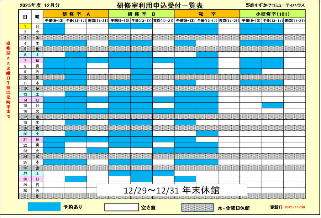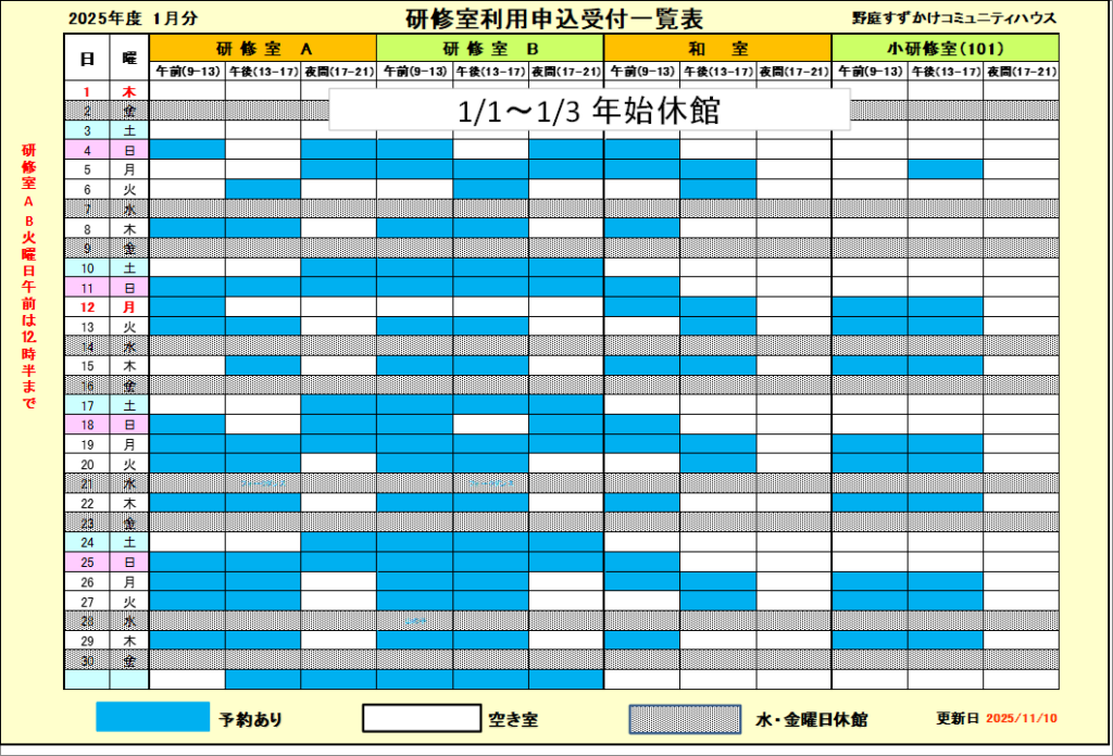 ※12月・1月の貸し部屋のご予約は、11月1日9:00~受付を開始いたします。